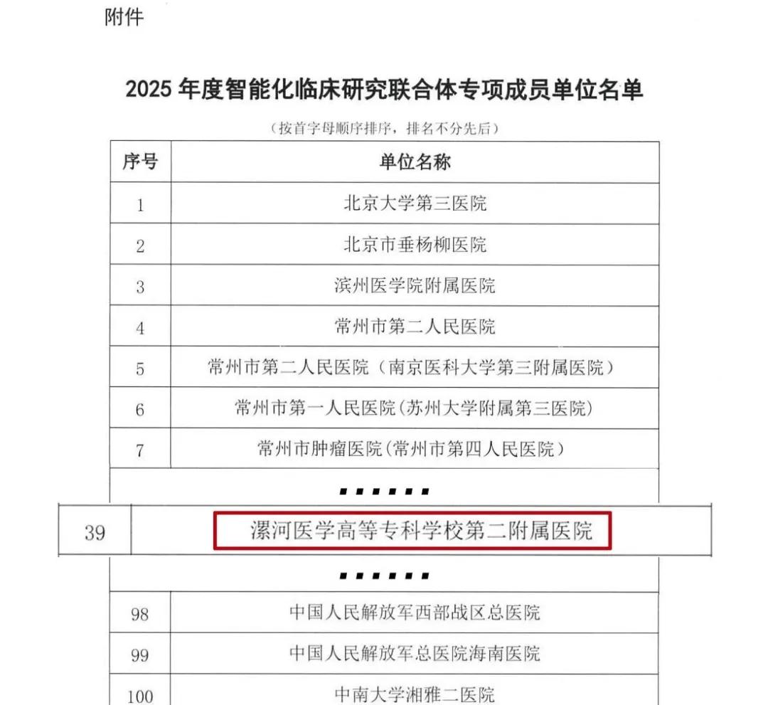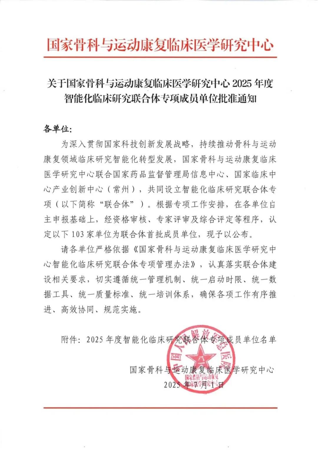 由國家骨科與運動康復(fù)臨床醫(yī)學(xué)研究中心(以下簡稱“國家臨床中心”)聯(lián)合國家藥品監(jiān)督管理局信息中心、國家臨床中心產(chǎn)業(yè)創(chuàng)新中心(常州)共同設(shè)立的“2025年度智能化臨床研究聯(lián)合體專項”已完成首批成員單位遴選,共103家單位成功入選(具體名單見文末附件),覆蓋全國26個省份。 其中漯河醫(yī)專二附院成功入選國家臨床中心“智能化臨床研究聯(lián)合體專項”首批成員單位