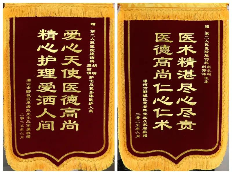 住院的日子里,每一天都讓患者感受到溫暖,每一名醫(yī)生,每一名護士,都讓他難忘。在出院時,患者及家屬激動不已:“沒想到我會恢復(fù)這么快,感謝你們的精湛醫(yī)術(shù),是你們給了我第二次生命!”為表示感謝,患者特地囑托身在外地的兒子定制了兩面錦旗,送至科室醫(yī)護手中。