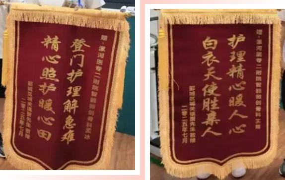 “真是太感謝孟冰和王露護(hù)士了,這兩面錦旗你們一定要收下!”7月16日,一名老年患者家屬將兩面錦旗送到了漯河醫(yī)專二附院(漯河市骨科醫(yī)院、漯河市立醫(yī)院)智能微創(chuàng)骨科護(hù)士站,再三感謝兩位護(hù)士上門為老人維護(hù)、更換導(dǎo)尿管。