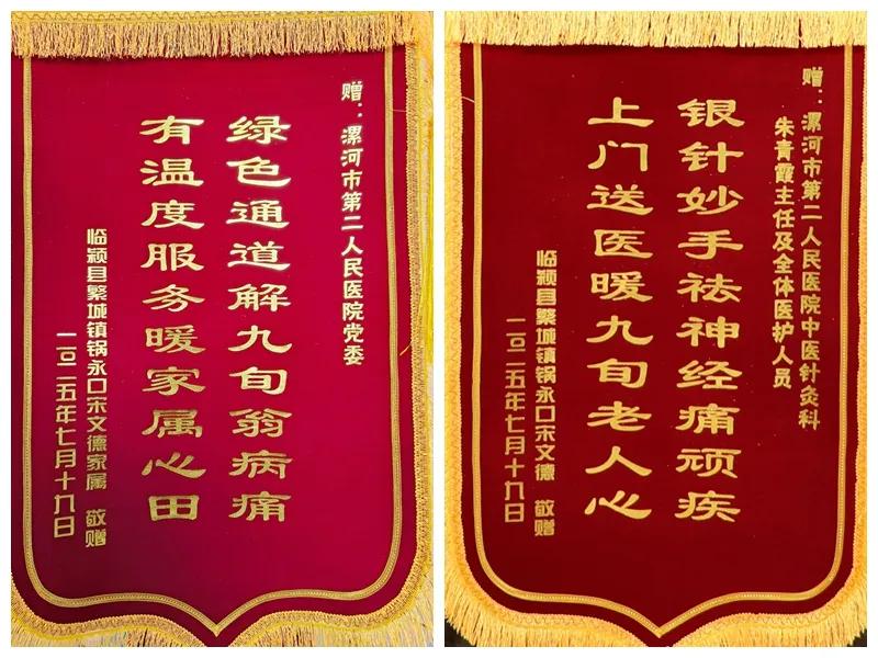 7月20日上午,市二院門診大廳暖意融融,92歲宋老先生的家屬手捧兩面錦旗,專程向醫(yī)院黨委和中醫(yī)針灸科表達最誠摯的謝意。副院長劉橋受院黨委委托與全國先進工作者、全國“五一”勞動獎章獲得者、中醫(yī)針灸科主任朱青霞及科室團隊熱情接待了家屬,并鄭重接過了這份沉甸甸的心意。