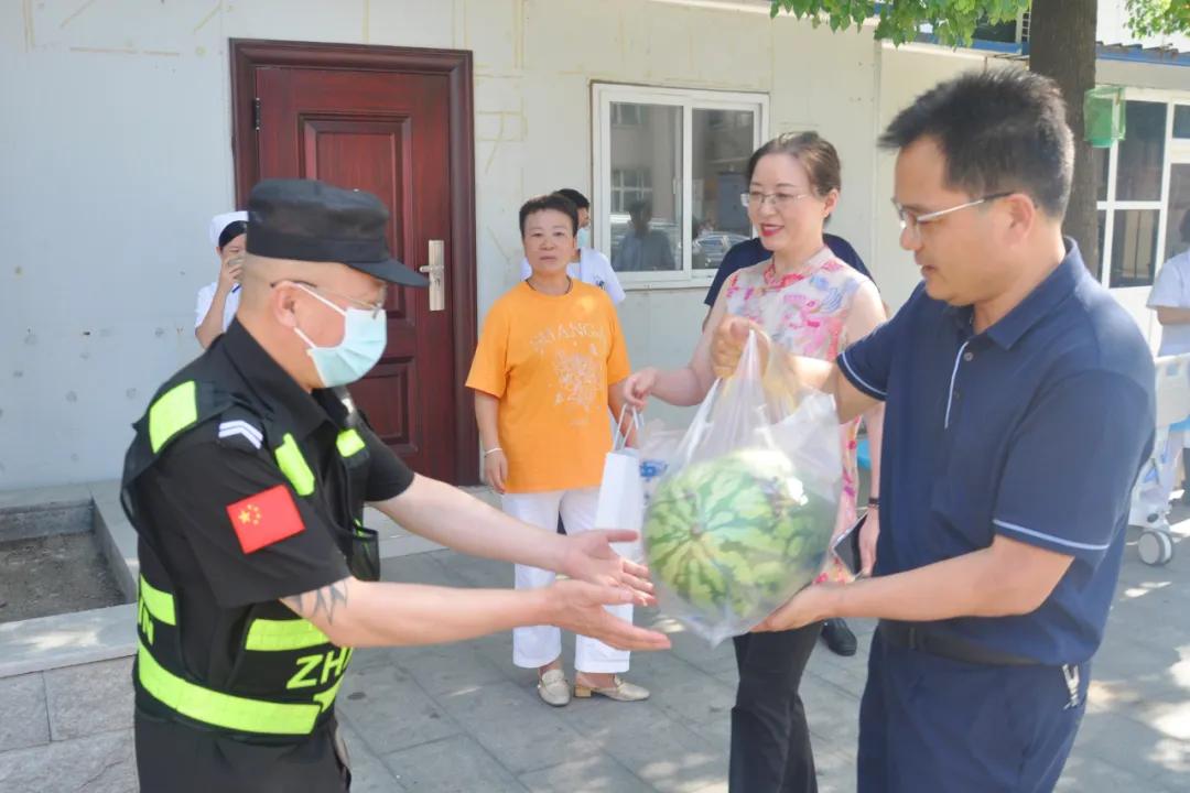 院領(lǐng)導(dǎo)帶隊(duì),工會(huì)、團(tuán)委志愿者組成慰問小組,慰問高溫酷暑中堅(jiān)守在各個(gè)崗位上的醫(yī)務(wù)、保安、保潔等工作人員。送去了包含酸梅湯、風(fēng)油精、西瓜等實(shí)用防暑降溫用品的“清涼包”。這些物品不僅能夠幫助職工在高溫環(huán)境下有效緩解暑熱燥氣,更體現(xiàn)了醫(yī)院對(duì)職工身心健康的深切關(guān)懷。