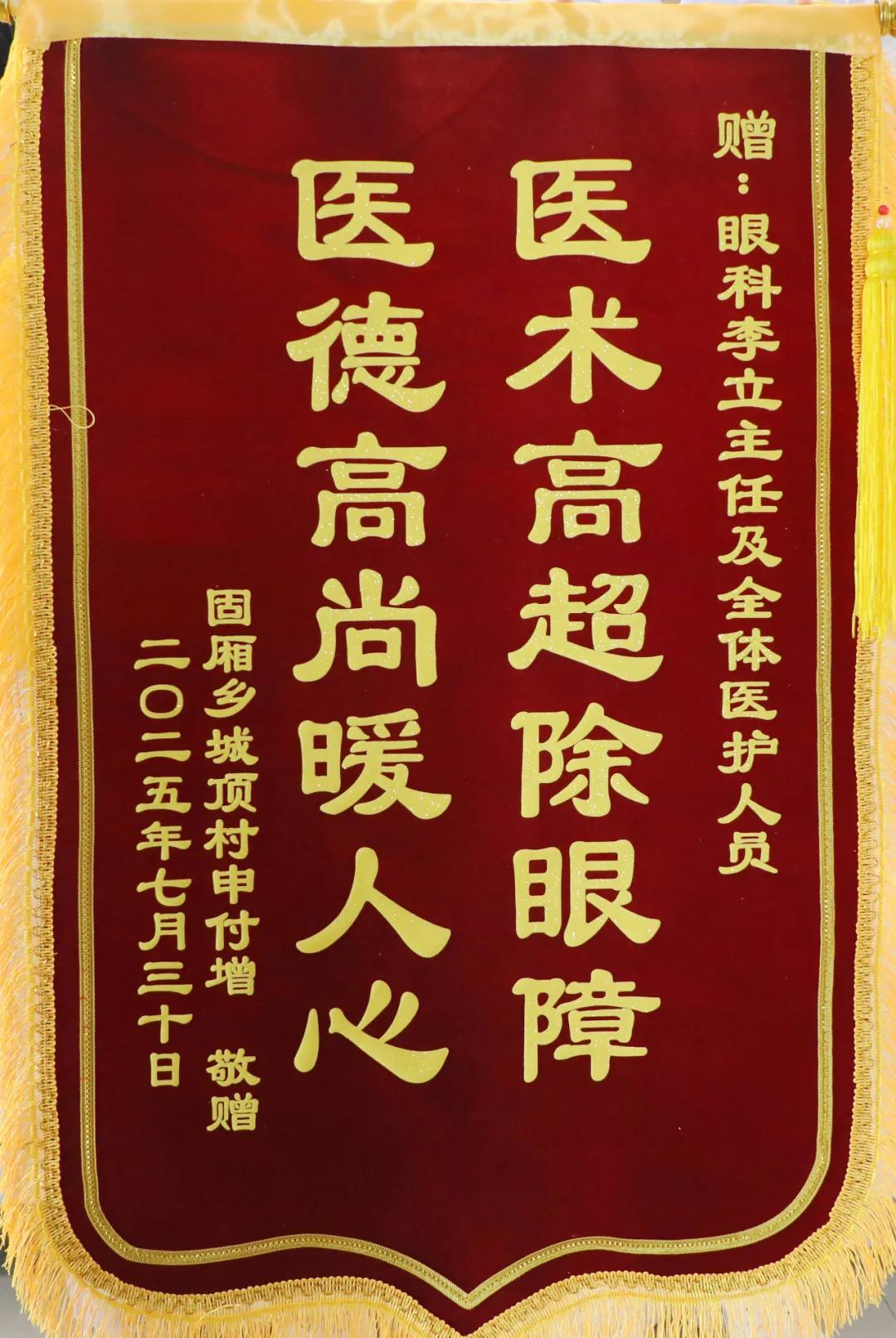 7月30日上午,臨潁縣固廂鄉(xiāng)城頂村黨支部書記楊勝武和該村申大爺家屬滿面笑容地將一面寫著“醫(yī)術高超除眼障,醫(yī)德高尚暖人心”的錦旗送到了市二院眼科病區(qū)。