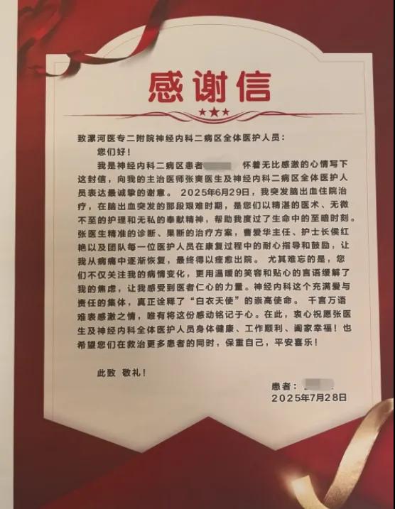 在漯河醫(yī)專二附院,與時(shí)間賽跑的生命救援不斷上演,醫(yī)護(hù)協(xié)作、醫(yī)患攜手,幫助患者順利康復(fù)的案例比比皆是。我們?cè)赣靡簧`一諾,守護(hù)群眾生命健康,踐行初心使命。(盧 闖 李佳瑩 劉 旭 袁錦鈺)