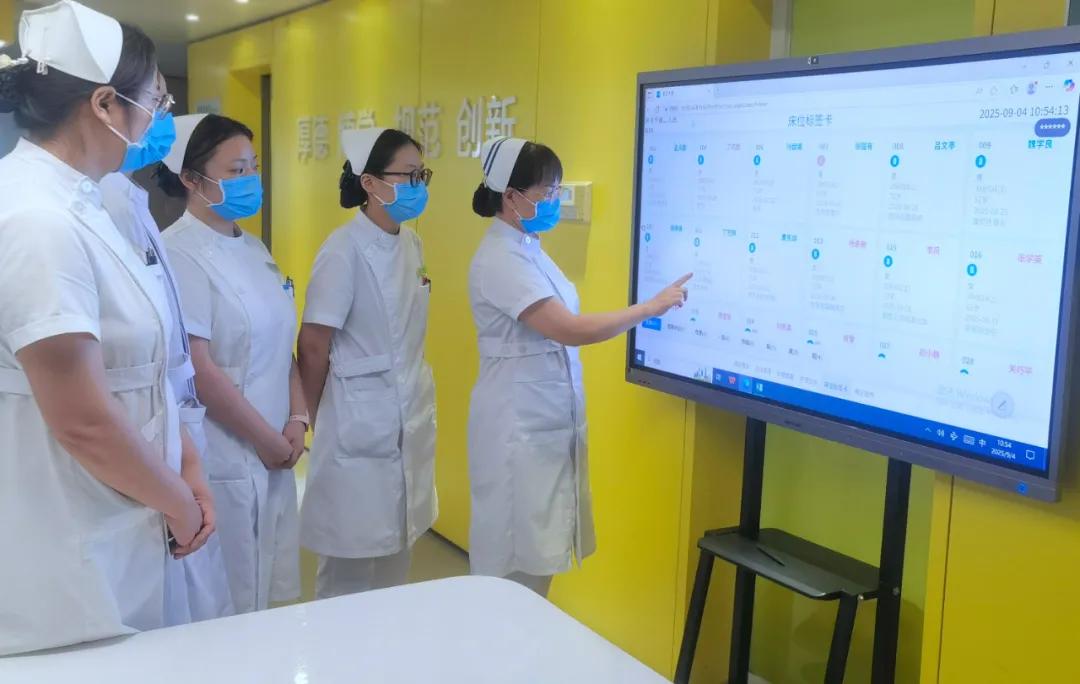護士站前,一場交班會正在進行:智慧大屏上,患者信息實時更新,護理內(nèi)容分類顯示,重點項目一屏盡覽。告別傳統(tǒng)手寫白板,降低人工轉(zhuǎn)抄差錯,大家通過點擊和切換不同場景,共同了解當(dāng)天的工作安排及注意事項。同時,互動大屏可以播放宣教資料,進一步豐富健康教育形式。
