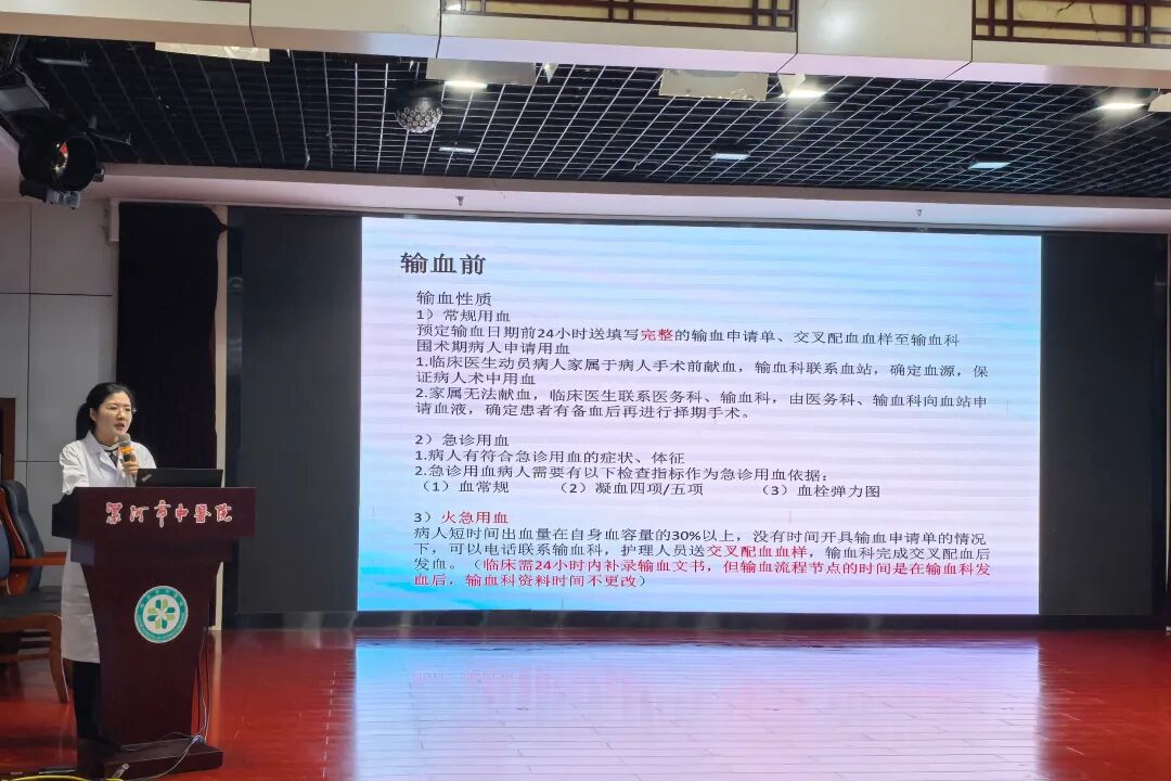 為進一步規(guī)范臨床輸血操作流程,強化醫(yī)護人員輸血安全意識,保障患者用血安全與醫(yī)療質(zhì)量,2025年9月12日至13日,漯河市中醫(yī)院輸血檢驗科在四樓會議室對全院醫(yī)護人員分批開展臨床輸血專項培訓。培訓由輸血檢驗科張丹丹講解。