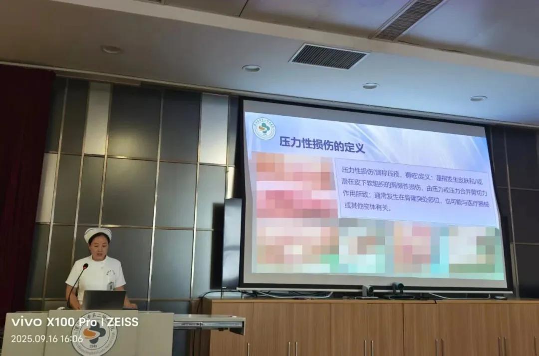 培訓(xùn)伊始,壓力性損傷/傷口護(hù)理學(xué)組會診干預(yù)組長張燕燕老師帶來關(guān)于《新型敷料在壓力性損傷中的應(yīng)用》的主題分享。她結(jié)合大量臨床案例,細(xì)致講解了各類新型敷料的材質(zhì)特性、適用場景,以及壓力性損傷不同分期對應(yīng)的敷料選擇策略、操作規(guī)范和效果評估方法。從水膠體敷料到泡沫敷料,從藻酸鹽敷料到銀離子敷料,張老師一一剖析,讓參訓(xùn)人員對新型敷料的臨床應(yīng)用有了更精準(zhǔn)、全面的認(rèn)識,為科學(xué)選擇和使用敷料提供了堅實(shí)理論支撐。