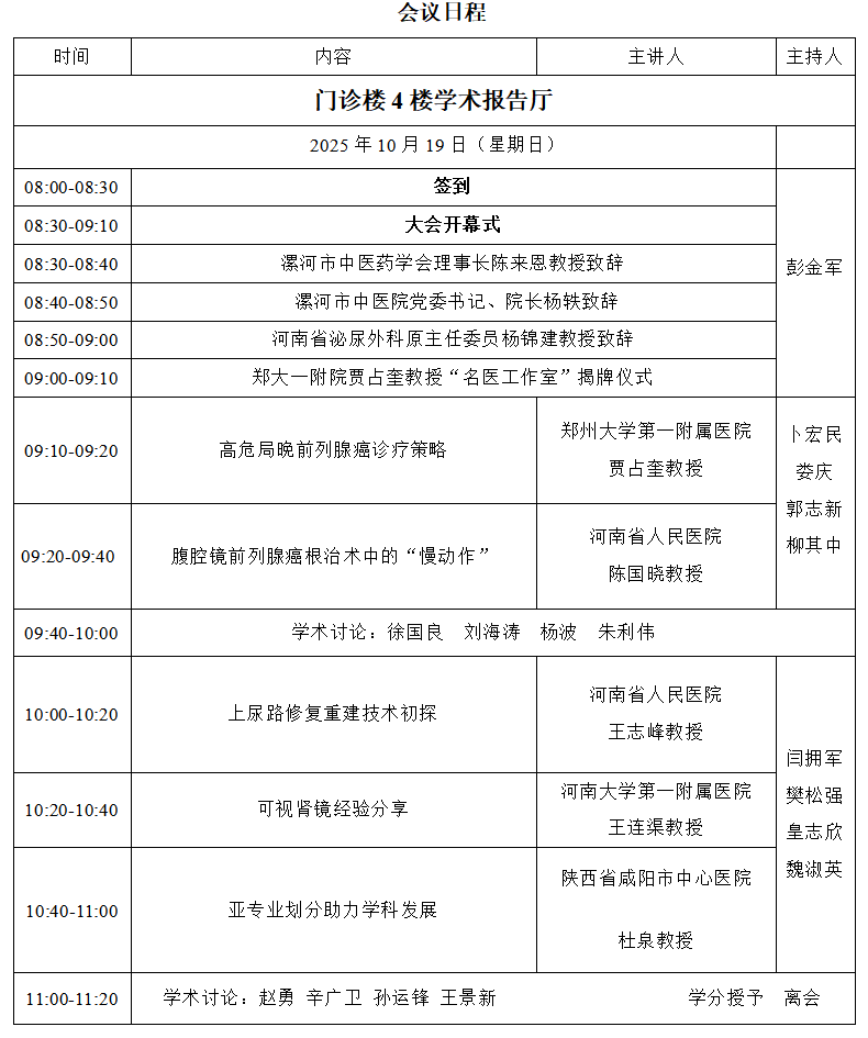 時間:2025年10月19日上午8:00-11:20 地點:漯河市中醫(yī)院門診四樓學(xué)術(shù)報告廳(漯河市源匯區(qū)交通路 649 號)