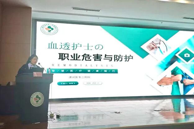 漯河醫(yī)專二附院血液凈化室骨干孫艷飛圍繞《血透護(hù)士的職業(yè)危害與防護(hù)》展開講解,從各個(gè)層面系統(tǒng)梳理了血透護(hù)士面臨的職業(yè)風(fēng)險(xiǎn),并提出了具體、可行的防護(hù)措施與建議,呼吁在全力關(guān)愛患者的同時(shí),務(wù)必重視自身的職業(yè)安全與身心健康,體現(xiàn)了深刻的人文關(guān)懷精神和團(tuán)隊(duì)管理智慧。由臨潁縣中醫(yī)院血液凈化室護(hù)士長(zhǎng)陳莉與舞陽縣中醫(yī)院血液凈化室護(hù)士長(zhǎng)張銳主持會(huì)議。
