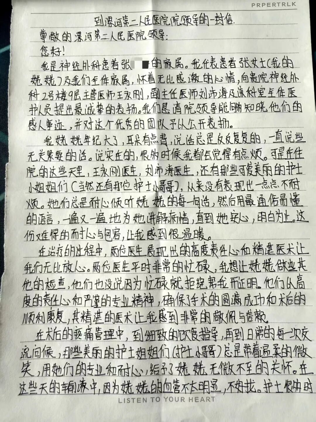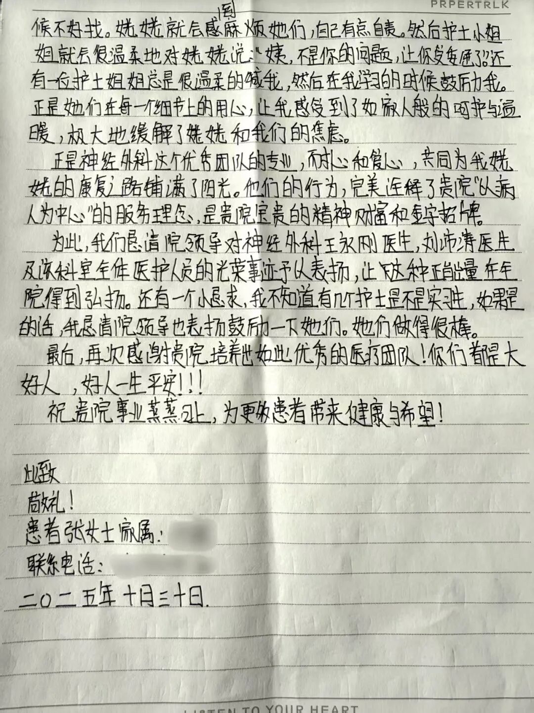 據(jù)了解,張女士的姥姥因“背部腫物”一直備受困擾,6年前在其他醫(yī)院手術(shù)治療后效果不佳,1年內(nèi)復(fù)發(fā),腫物逐漸增大,并出現(xiàn)肩部活動受限伴肩部疼痛。來到市二院后神經(jīng)外科醫(yī)生立即進(jìn)行手術(shù),因術(shù)中腫物與周圍組織粘連嚴(yán)重,手術(shù)歷時(shí)近2個小時(shí),術(shù)后恢復(fù)良好。“我的姥姥年紀(jì)大了,耳朵有點(diǎn)背,說話總是反反復(fù)復(fù),啰啰嗦嗦的。說實(shí)在的,有時(shí)候我都會覺得有點(diǎn)煩。可是從住院以來,劉沛濤主任、王永剛醫(yī)生,還有那些美麗可愛的護(hù)士小姐姐們和帥氣的護(hù)士小哥哥,從來沒有表現(xiàn)出一點(diǎn)點(diǎn)不耐煩。他們總是耐心地聽姥姥講,一遍遍地解釋給她聽,直到她聽懂為止。”張女士的表揚(yáng)信中字里行間包含著對神經(jīng)外科整個醫(yī)護(hù)團(tuán)隊(duì)暖心服務(wù)的認(rèn)可與贊美。