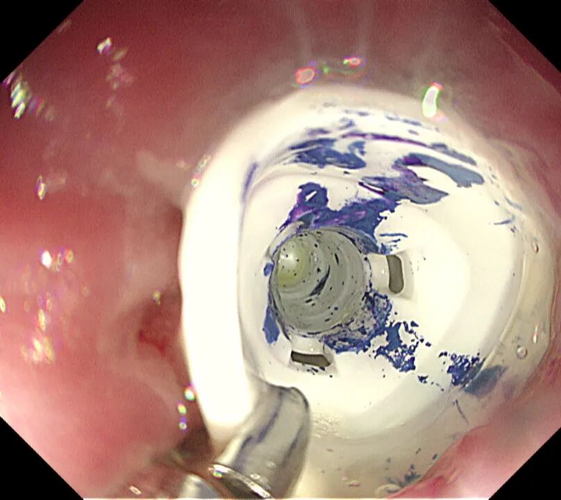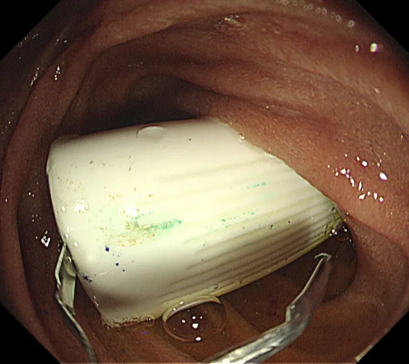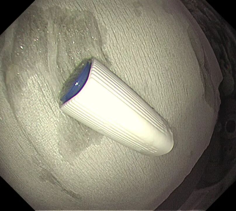 時(shí)間不等人,雖已臨近晚7點(diǎn),市二院第一時(shí)間啟動(dòng)應(yīng)急響應(yīng)機(jī)制,內(nèi)鏡室、麻醉科醫(yī)護(hù)技立即返崗就位,并經(jīng)院辦等職能部門積極協(xié)調(diào),盡可能縮短術(shù)前準(zhǔn)備時(shí)間,迅速制定了取出異物的方案。隨后,在全身麻醉下,朗朗安然入睡,醫(yī)生通過(guò)纖細(xì)的胃鏡,精準(zhǔn)地找到了那個(gè)“惹事”的筆帽位于十二指腸內(nèi),并順利將其取出。整個(gè)過(guò)程僅用時(shí)十幾分鐘,朗朗術(shù)后很快蘇醒,觀察無(wú)礙后平安回家。