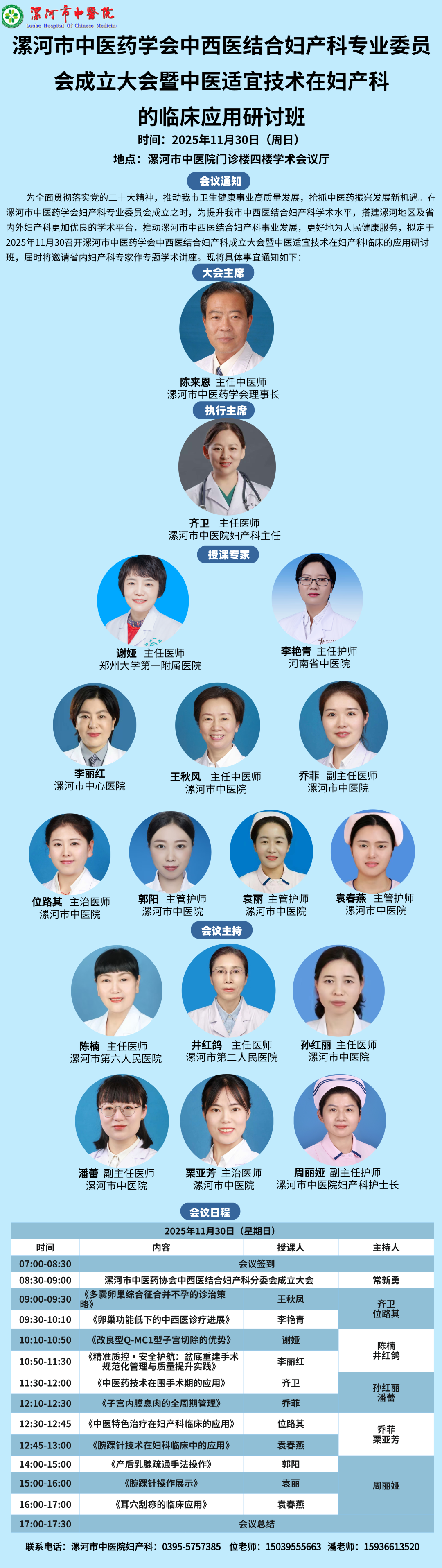 【學(xué)術(shù)通知】11月30日,漯河市中醫(yī)藥學(xué)會(huì)中西醫(yī)結(jié)合婦產(chǎn)科專(zhuān)業(yè)委員會(huì)成立大會(huì)暨中醫(yī)適宜技術(shù)在婦產(chǎn)科的臨床應(yīng)用研討班