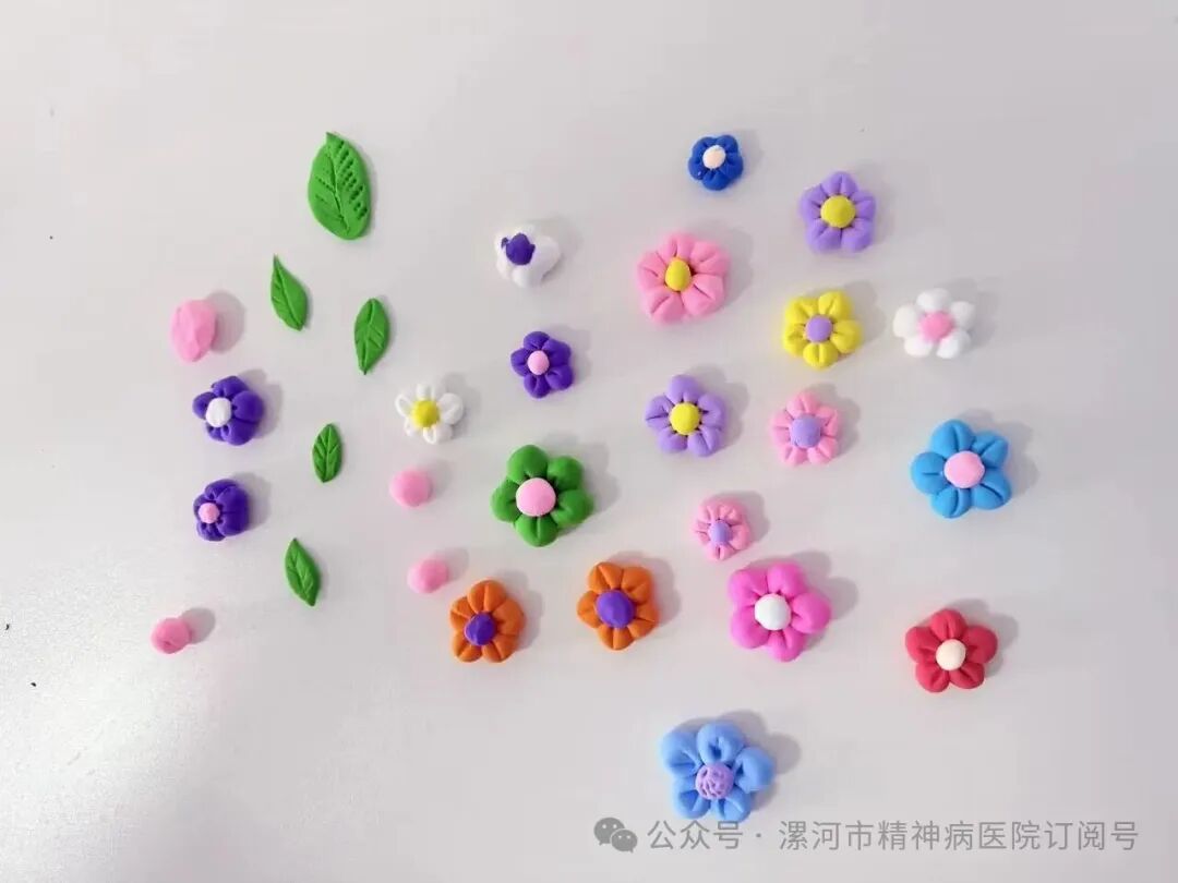大家先挑了喜歡的顏色粘土再把粘土搓成小圓球、按成花瓣形,有患者捏了粉白的小梅花,說“看著像冬天里開的”;還有患者做了撞色的太陽花,“顏色亮,看著就開心”;也有患者在細枝上粘了小小的“花苞”,說“等它慢慢開”。