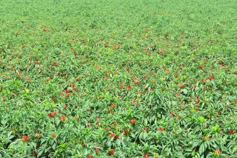 種植時采用5G北斗導航無人駕駛機械進行辣椒直播,在直播時播種機直接播種辣椒種子,同時可同步鋪設滴管帶、地膜、下種子、一次成型完成辣椒播種任務,一臺辣椒播種機每天可直播辣椒60畝至70畝,可代替100多人移栽。由于辣椒機械化直播沒有移栽環(huán)節(jié),辣椒根系發(fā)達,植株健壯,防草驅蟲,不容易出現(xiàn)死棵爛苗的現(xiàn)象,明顯減少了農藥和水的用量。每畝7500穴,每穴雙株,每畝可種植辣椒15000株,省時、省力、省工、省錢而且又高產(chǎn),一般畝產(chǎn)干辣椒800—1000斤,如果管理得當畝產(chǎn)突破1000斤是沒有問題的。