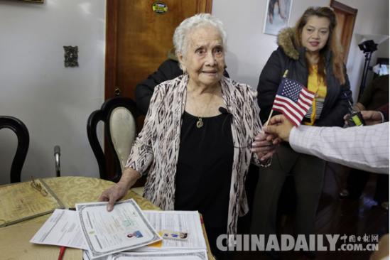中國日報(bào)網(wǎng)11月24日電(潘一僑) 據(jù)美聯(lián)社23日報(bào)道,一位與美國同名的99歲老奶奶,于23日正式宣誓成為美國公民。
