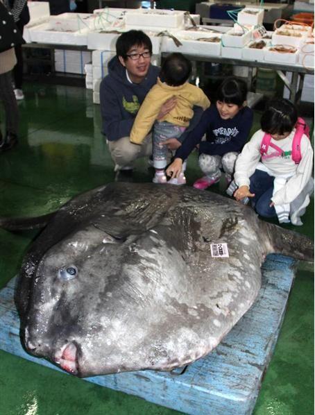 據(jù)日媒報道,大翻車魚當(dāng)初掛在了在香住海面設(shè)置的定制網(wǎng)上,從魚港被運往直銷店時還是活的。店長山田直弘興奮地說道“看了30多年的鮮魚,還是第一次看到如此大的翻車魚”。