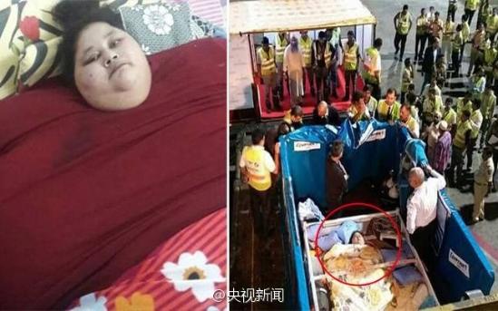 2月11日凌晨,體重高達(dá)500公斤的埃及婦女伊曼•阿邁德,乘飛機(jī)抵達(dá)印度孟買進(jìn)行減肥手術(shù)。伊曼今年36歲,已有25年沒有走出過屋子。航空公司為她特別改造了機(jī)艙,她下機(jī)也是通過起重機(jī)把她以及她躺臥的床一起從飛機(jī)上起吊到貨車上送往醫(yī)院。(央視記者程煒) ????圖片來源:中央電視臺(tái)新聞中心官方微博