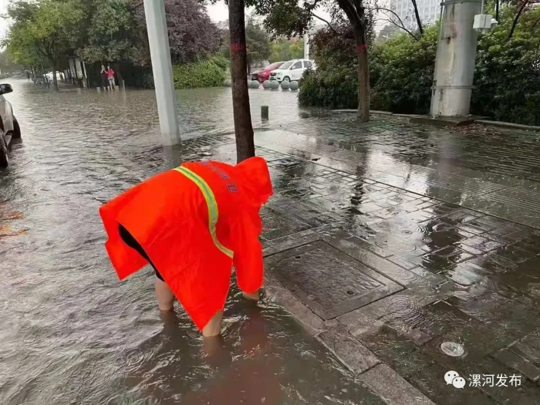 解放路北段,工作人員清理窨井篦子雜物,加速積水排放!