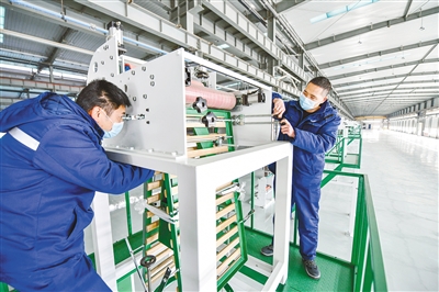 1月30日,位于郾城區(qū)孟廟鎮(zhèn)的中科新投(漯河)新材料有限公司車間內(nèi),工人們正在安裝新設(shè)備。該公司成立于2022年4月,注冊資本2億元,主要生產(chǎn)可降解的環(huán)保購物袋、外賣餐盒、農(nóng)用地膜等,年產(chǎn)量預(yù)計達50萬噸。記者 焦海洋 攝