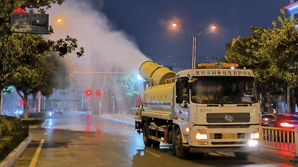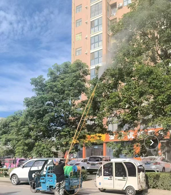 區(qū)園林職工運(yùn)用高射程噴霧車(chē)噴藥物防治白粉虱