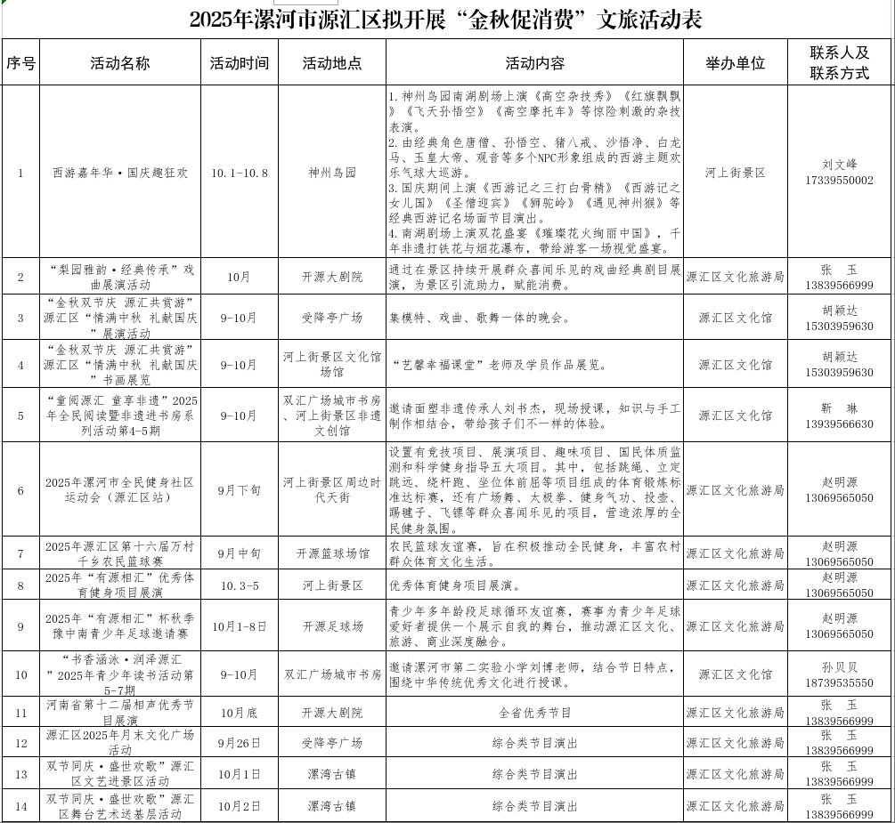為深入貫徹落實(shí)國家、省、市關(guān)于促進(jìn)文旅消費(fèi)的決策部署,進(jìn)一步激發(fā)全區(qū)文旅市場活力、提振消費(fèi)信心、點(diǎn)燃群眾消費(fèi)熱情,拉動文旅消費(fèi)增長,源匯區(qū)文旅局采取三項有力措施,精心籌備并扎實(shí)推進(jìn)金秋文旅消費(fèi)季活動。