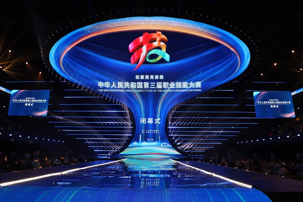 中華人民共和國第三屆職業(yè)技能大賽閉幕式上,自主移動機器人(世賽選拔項目)金牌獲得者楊奇瑞、介明鑫,工業(yè)視覺系統(tǒng)運維(國賽精選項目)金牌獲得者王華磊,機器人系統(tǒng)集成(世賽選拔項目)銀牌獲得者彎有道、王永康上臺領(lǐng)獎。