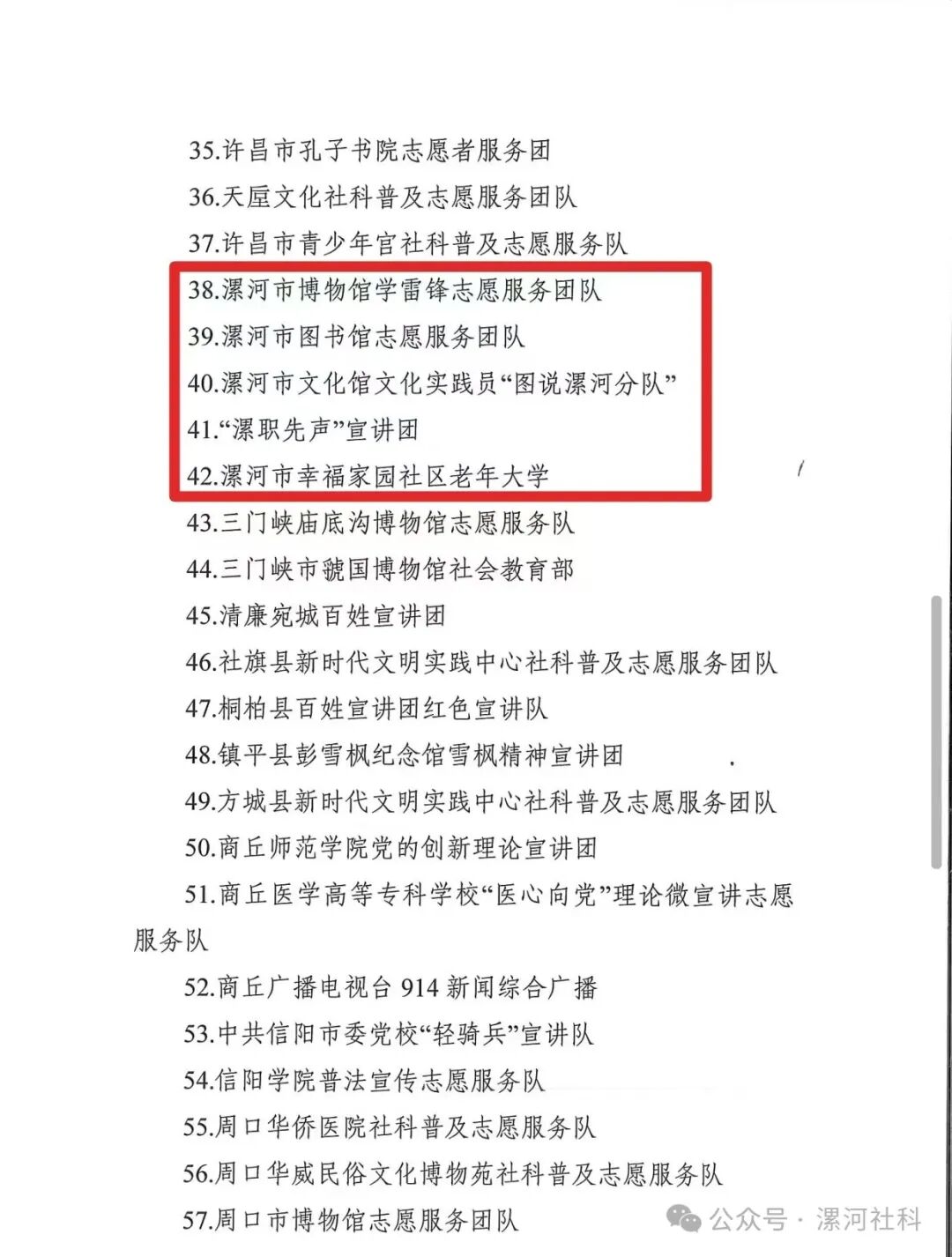 2024年社科普及志愿服務(wù)活動表現(xiàn)突出社科普及志愿服務(wù)團隊(5個):漯河市博物館學(xué)雷鋒志愿服務(wù)團隊;漯河市圖書館志愿服務(wù)團隊;漯河市文化館文化實踐員“圖說漯河分隊”;“漯職先聲”宣講團;漯河市幸福家園社區(qū)老年大學(xué)