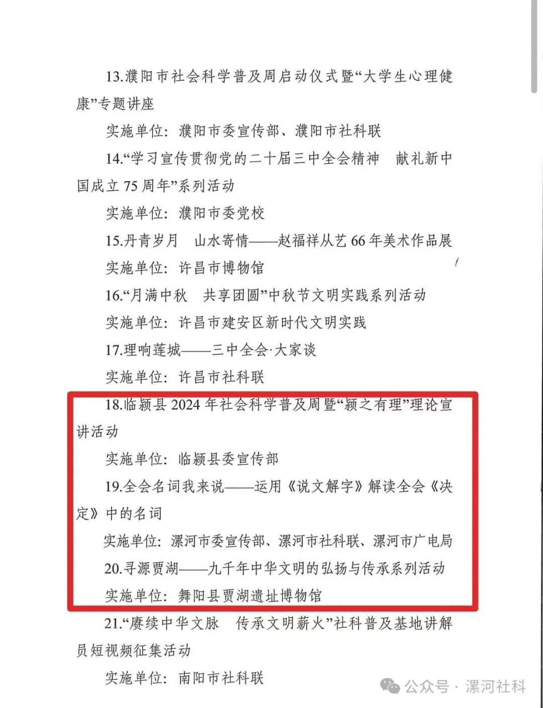 2024年河南省社科普及周活動表現(xiàn)突出特色活動(3個):臨潁縣2024年社會科學(xué)普及周暨“潁之有理”理論宣講活動(實施單位:臨潁縣委宣傳部);全會名詞我來說——運用《說文解字》解讀全會《決定》中的名詞(實施單位:漯河市委宣傳部、漯河市社科聯(lián)、漯河市廣電局);尋源賈湖——九千年中華文明的弘揚與傳承系列活動(實施單位:舞陽縣賈湖遺址博物館)