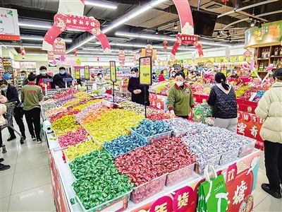 當(dāng)天下午,記者來(lái)到遼河路丹尼斯超市。超市內(nèi)紅色成了主色調(diào),洋溢著濃濃的喜慶氣氛。福字、中國(guó)結(jié)等傳統(tǒng)擺飾已經(jīng)上架,糖果、巧克力、餅干等年貨琳瑯滿目,水果、蔬菜、干貨、大米等商品也非常充足。