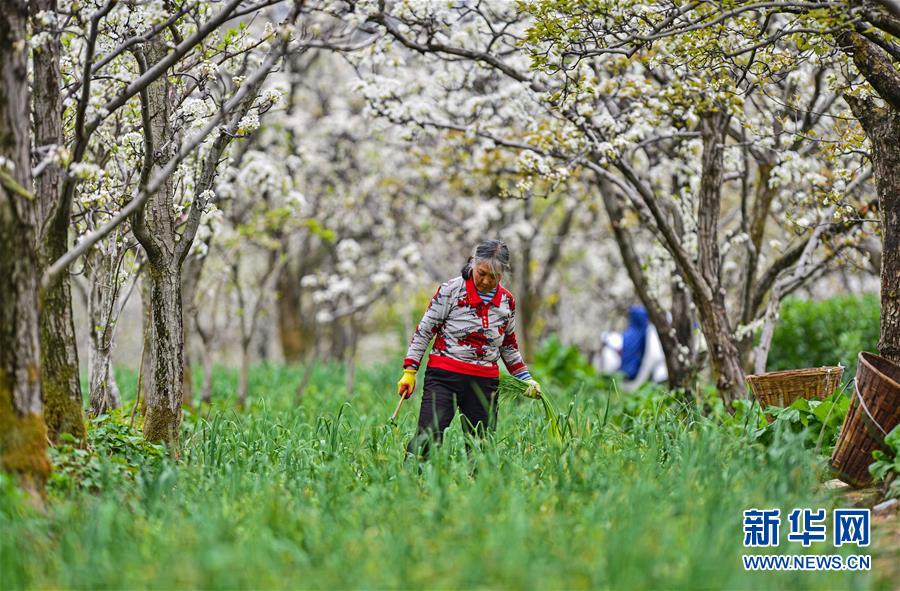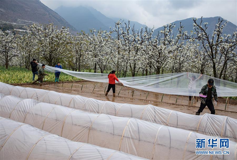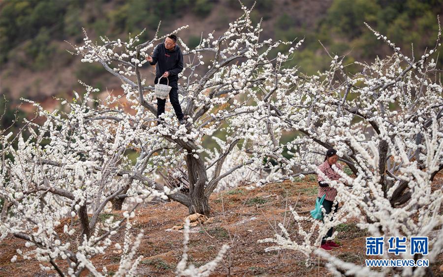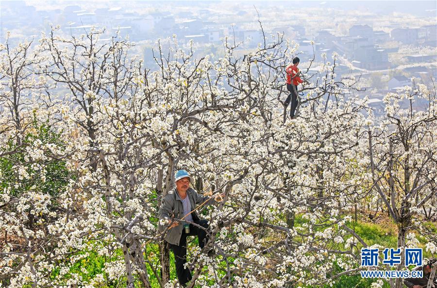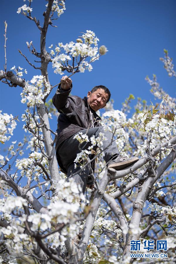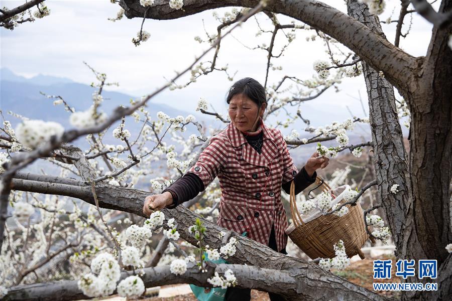 3月19日,漢源縣九襄鎮(zhèn)新堰村村民對(duì)梨花人工授粉。 隨著氣溫回升和春雨到來,四川省漢源縣九襄鎮(zhèn)等地的村民投入到疏花、人工授粉、育苗等農(nóng)業(yè)勞動(dòng)中。 新華社記者 江宏景 攝