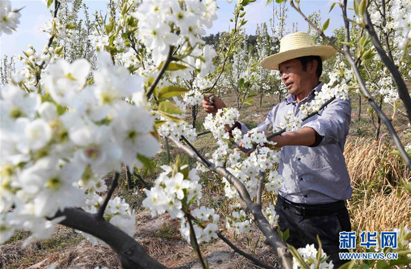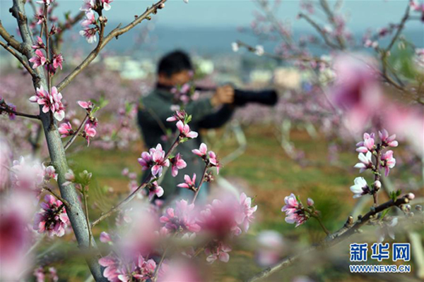 3月22日,云南省曲靖市沾益區(qū)炎方鄉(xiāng)炎方村的農(nóng)民在果園里作業(yè)。 春季里,云南省曲靖市沾益區(qū)鄉(xiāng)村果園里的桃花梨花競相綻放,景色秀美,吸引游人前來觀光。 新華社記者 楊宗友 攝