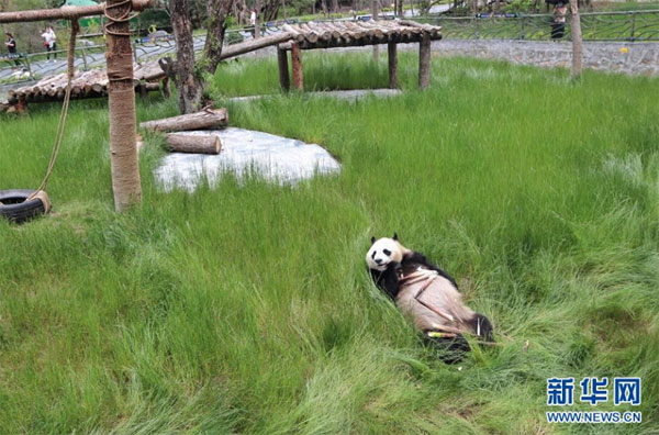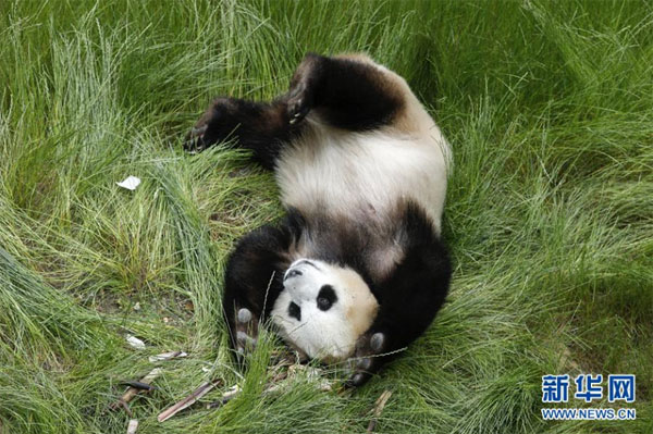在位于四川省阿壩藏族羌族自治州的九寨溝大熊貓園,大熊貓“海海”在打滾(6月19日攝)。 近日,位于四川九寨溝縣勿角大熊貓自然保護(hù)區(qū)內(nèi)的九寨溝大熊貓園開(kāi)園迎客,從中國(guó)大熊貓保護(hù)研究中心遷入的4只大熊貓“小禮物”“海海”“天天”“新新”正式與公眾見(jiàn)面。全國(guó)第四次大熊貓調(diào)查報(bào)告顯示,九寨溝縣有野生大熊貓31只,其中勿角大熊貓自然保護(hù)區(qū)內(nèi)有22只。 新華社記者 沈伯韓 攝