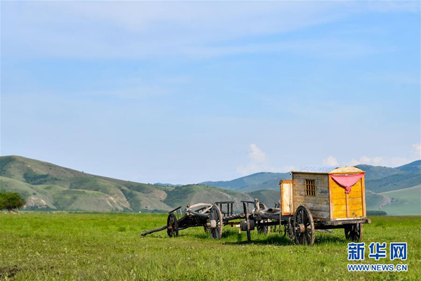 烏蘭毛都草原上的勒勒車(chē)(7月1日攝)。 盛夏時(shí)節(jié),內(nèi)蒙古興安盟科爾沁右翼前旗的烏蘭毛都草原綠意盎然,風(fēng)景醉人。 烏蘭毛都草原地處大興安嶺南麓,屬丘陵山地草原,風(fēng)光獨(dú)特。 新華社記者 貝赫 攝