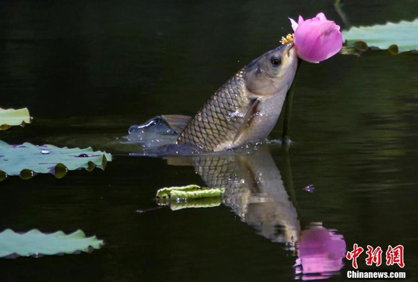 7月3日,在成都工業(yè)學(xué)院一荷塘里上演“魚吃荷花”景觀,魚兒圍繞荷花游動(dòng),不時(shí)地躍出水面撕咬荷花,場(chǎng)面生動(dòng)有趣。中新社記者 王磊 攝