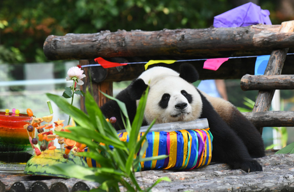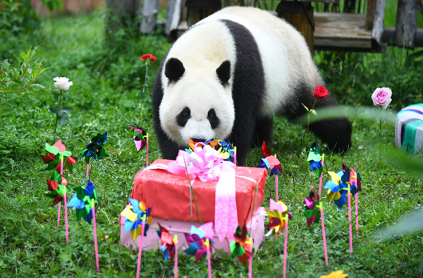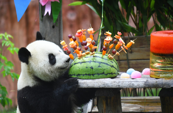 7月30日,大熊貓“初心”準(zhǔn)備享用生日禮物