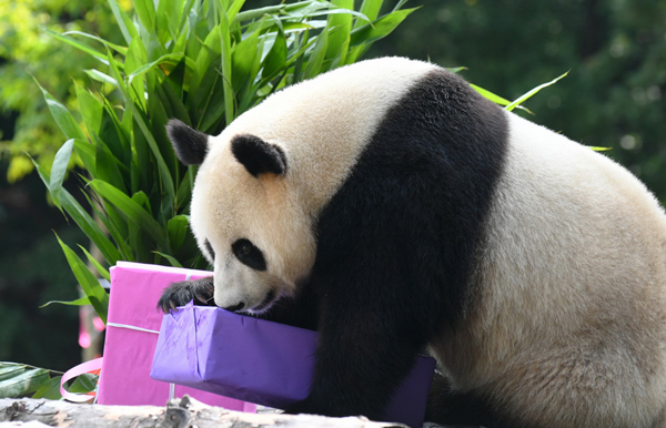 7月30日,大熊貓“牧云”準(zhǔn)備拆開工作人員為它準(zhǔn)備的生日禮物。