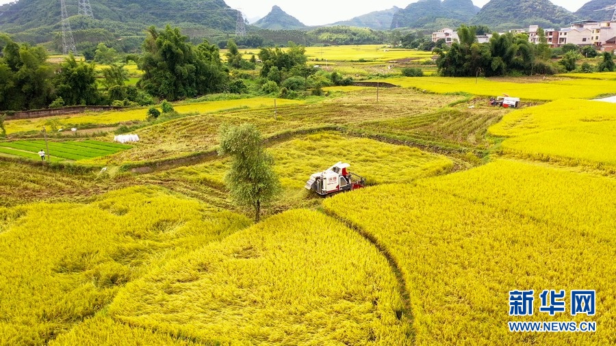 近日,在廣西柳州市魚峰區(qū)里雍鎮(zhèn)龍江村,各種農(nóng)用機(jī)械開進(jìn)場,拉開了早稻收割的序幕。一眼望去,成片的早稻在陽光下金燦燦一片,當(dāng)?shù)剞r(nóng)民抓緊晴好天氣收獲歸倉。