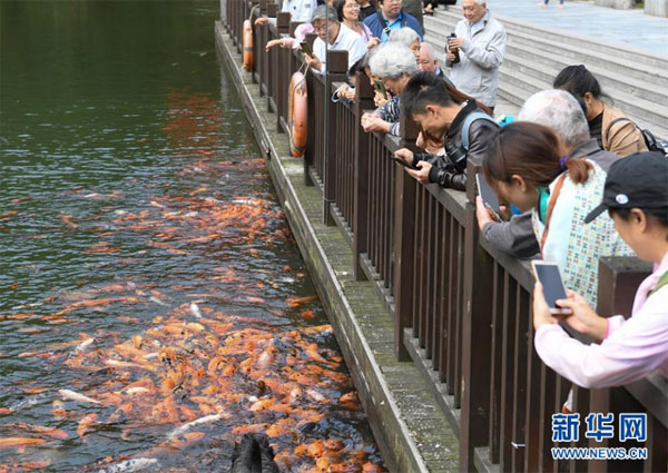10月5日,游客在臨安區(qū)大明山景區(qū)觀魚(yú)。 中秋和國(guó)慶假期,不少游客來(lái)到浙江杭州臨安區(qū)的山間游玩,和大自然親密接觸。 新華社記者 翁忻旸 攝