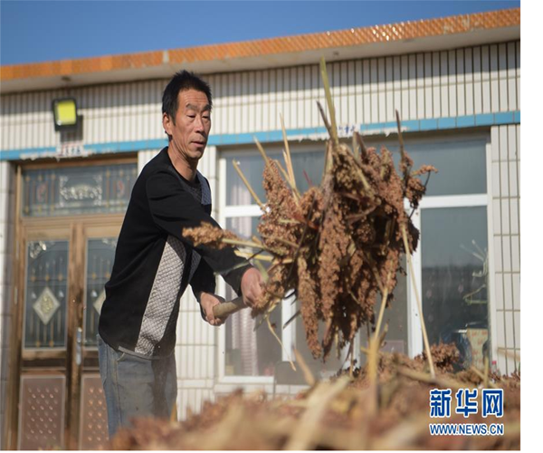 內(nèi)蒙古自治區(qū)奈曼旗青龍山鎮(zhèn)互利村脫貧戶王洪巖在干農(nóng)活(11月4日攝)。 新華社記者 李志鵬 攝