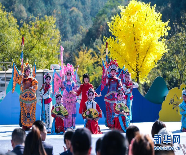 11月12日,在“十里古銀杏長廊”景區(qū)內(nèi),小浦鎮(zhèn)中心小學(xué)“小京班”的孩子在為游客表演京劇。新華社記者 徐昱 攝