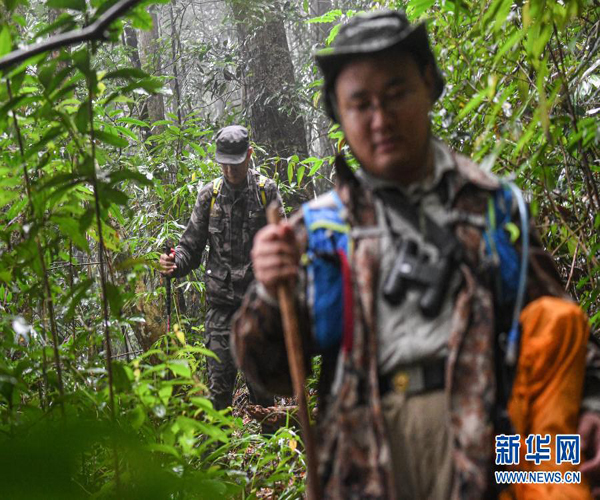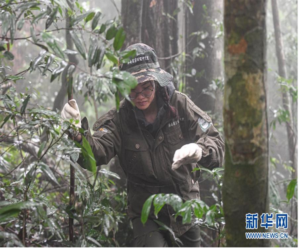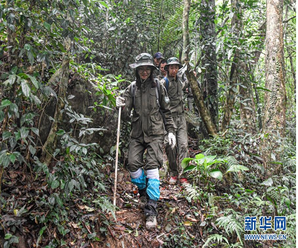 11月16日,調(diào)查人員在海南霸王嶺的熱帶雨林中尋找海南長(zhǎng)臂猿猿食植物樣本。