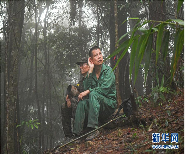 11月16日清晨,調(diào)查人員在海南霸王嶺熱帶雨林中監(jiān)聽(tīng)海南長(zhǎng)臂猿鳴叫,希望根據(jù)猿聲找到海南長(zhǎng)臂猿。