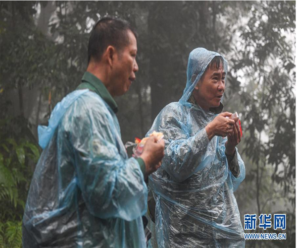 11月16日,工作人員在海南霸王嶺調(diào)查海南長(zhǎng)臂猿期間吃干糧補(bǔ)充體能。