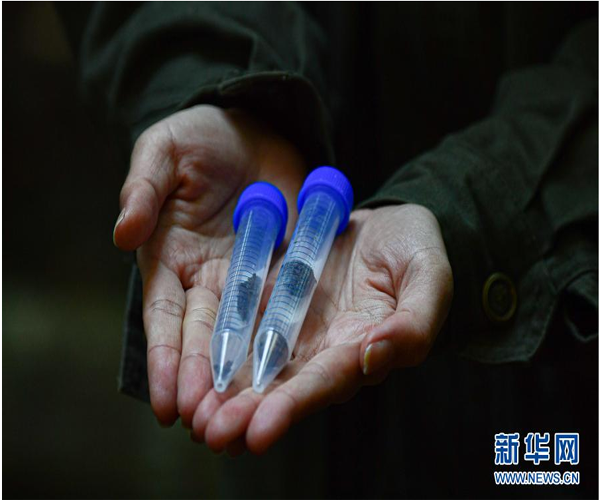 11月13日,調(diào)查人員展示在海南霸王嶺熱帶雨林中采集的海南長(zhǎng)臂猿糞便樣本。
