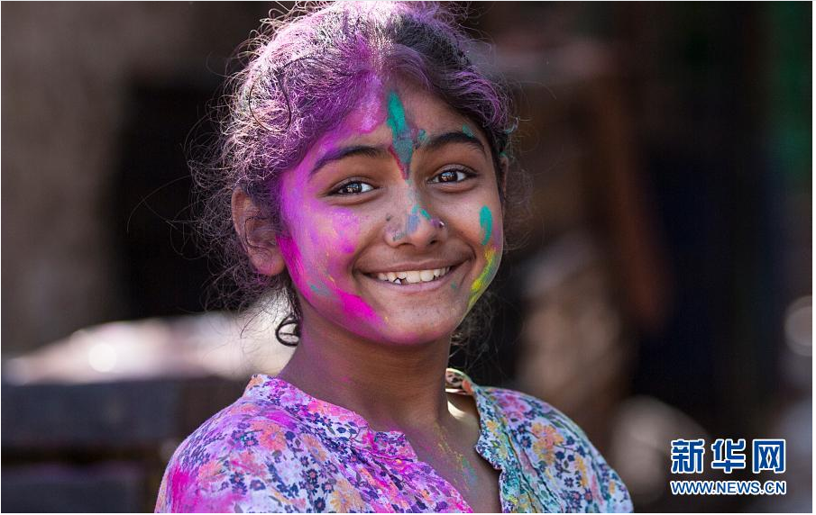 3月10日,在印度新德里,一名女孩參加灑紅節(jié)慶?;顒?dòng)。