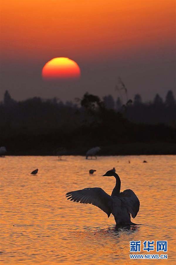 12月21日,天鵝等候鳥在南昌五星白鶴保護(hù)小區(qū)的濕地中棲息。