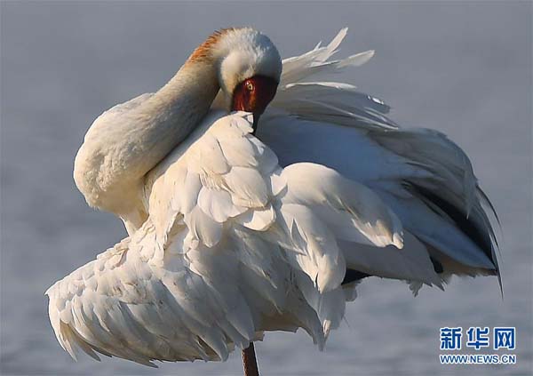 12月21日,白鶴在南昌五星白鶴保護(hù)小區(qū)的濕地中棲息。