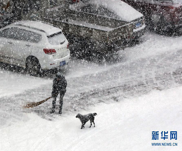 1月5日,山東煙臺(tái)街頭,一名市民在雪中清掃路面。 當(dāng)日是小寒節(jié)氣,受強(qiáng)冷空氣影響,山東煙臺(tái)迎來降雪。