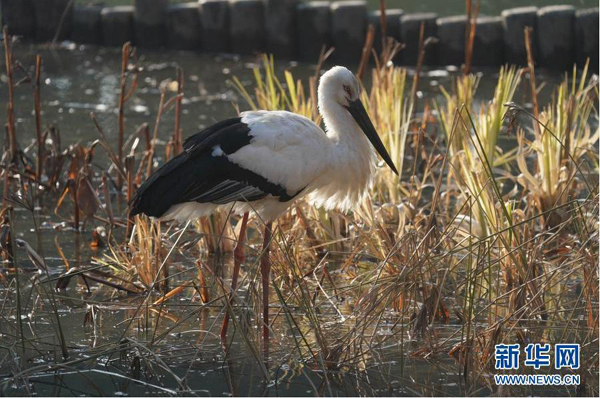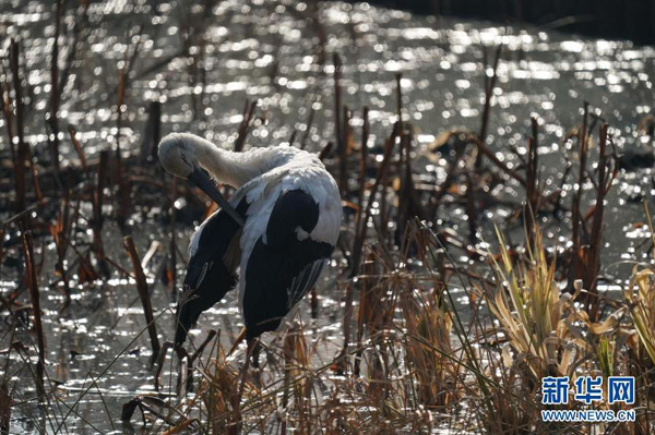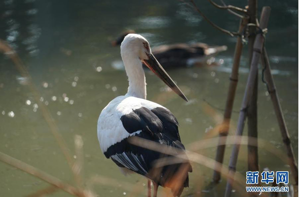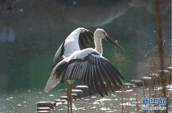 兩只受傷后被送來醫(yī)治的東方白鸛享受冬日暖陽。受益于公眾環(huán)保意識的提升,一些意外受傷的候被人們發(fā)現(xiàn)后