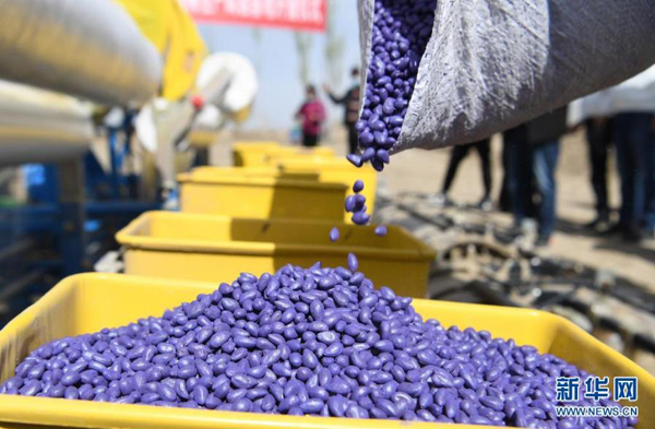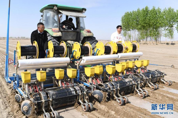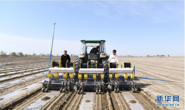 中國農(nóng)業(yè)科學(xué)院棉花研究所生物技術(shù)研究室主任袁有祿(左)、國家棉花產(chǎn)業(yè)聯(lián)盟副理事長王進(jìn)華在喀什地區(qū)莎車縣指導(dǎo)播種(4月11日攝)。