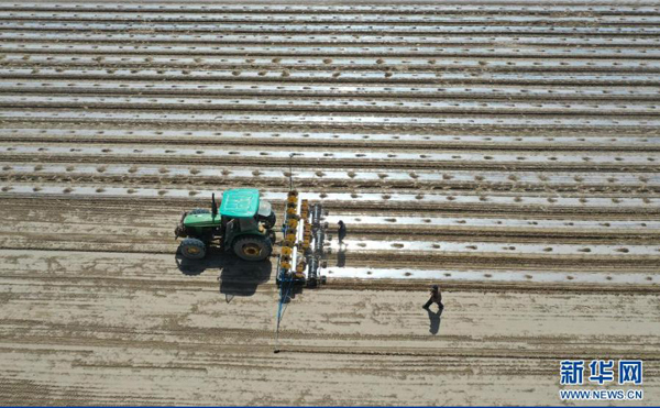 棉農(nóng)在喀什地區(qū)莎車縣播種“中棉所127”品種棉花(4月11日攝,無人機(jī)照片)。